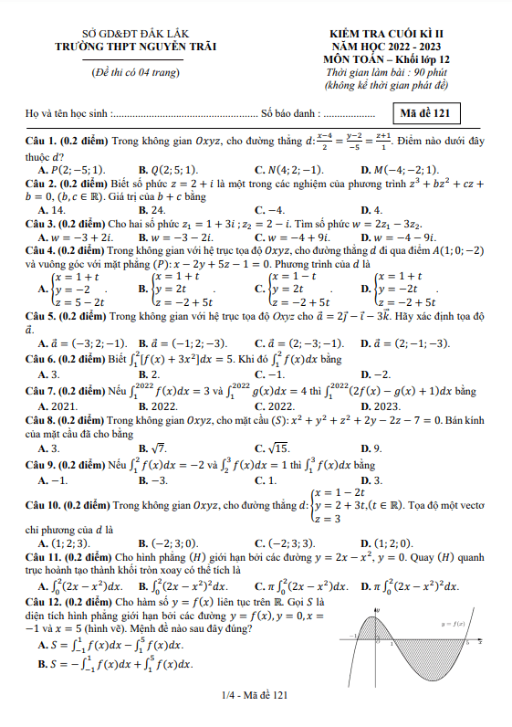 Đề Cuối Học Kỳ 2 Môn Toán Lớp 12 Năm 2022 – 2023 Trường THPT Nguyễn Trãi Đắk Lắk
