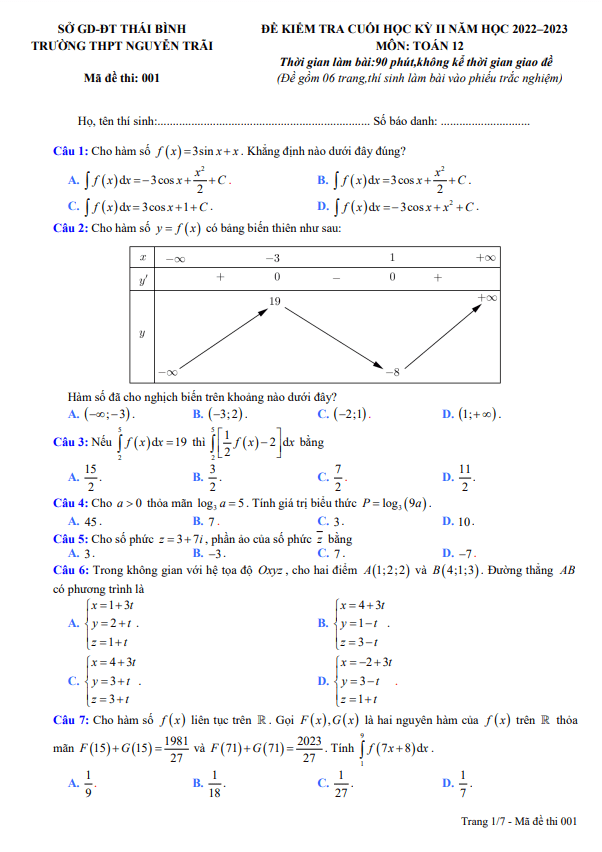 Đề cuối kỳ 2 Toán lớp 12 năm 2022 – 2023 trường THPT Nguyễn Trãi – Thái Bình