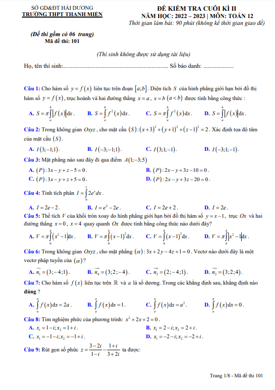 Xin chào quý thầy cô và các em học sinh lớp 12! Dưới đây là đề kiểm tra cuối học kỳ 2 môn Toán lớp 12 năm học 2022-2023 của trường THPT Thanh Miện, tỉnh Hải Dương.