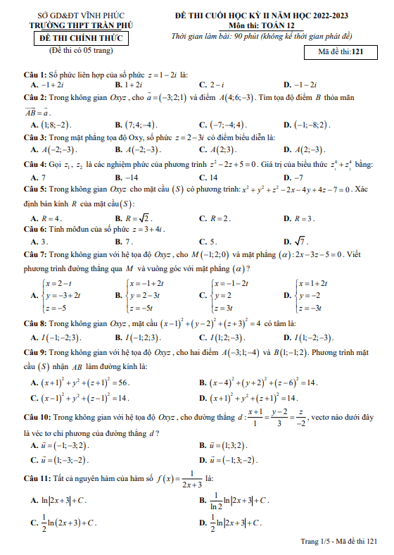 Đề cuối học kỳ 2 môn Toán lớp 12 năm 2022 – 2023 trường THPT Trần Phú Vĩnh Phúc