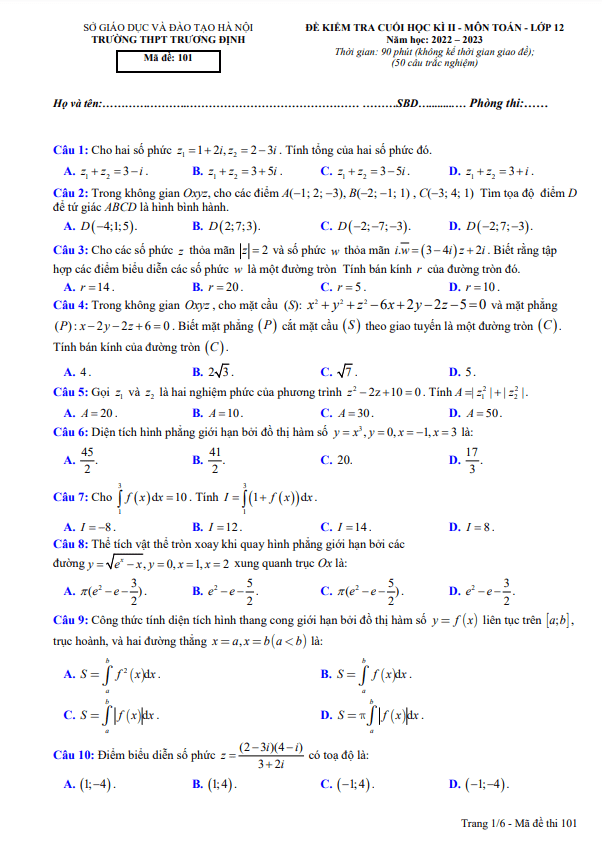 Sytu xin gửi tới quý thầy cô và các em học sinh lớp 12 đề kiểm tra cuối học kì 2 môn Toán năm 2022 – 2023 trường THPT Trương Định ở Hà Nội. Đề thi bao gồm đáp án trắc nghiệm mã đề 101.