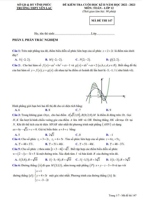 Chào mừng đến với bài viết giới thiệu về đề cuối học kì 2 môn Toán lớp 12 năm 2022 – 2023 tại trường THPT Yên Lạc, Vĩnh Phúc! Đề kiểm tra bao gồm 30 câu trắc nghiệm (chiếm 60%) và 5 câu tự luận (chiếm 40%), thời gian 90 phút. Đề thi có đáp án, lời giải và hướng dẫn chấm điểm mã đề 147.