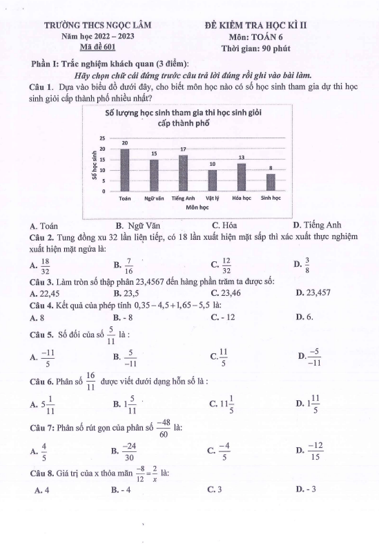 Trích dẫn một số câu hỏi từ Đề cuối học kì 2 Toán lớp 6 năm 2022 – 2023 trường THCS Ngọc Lâm – Hà Nội: