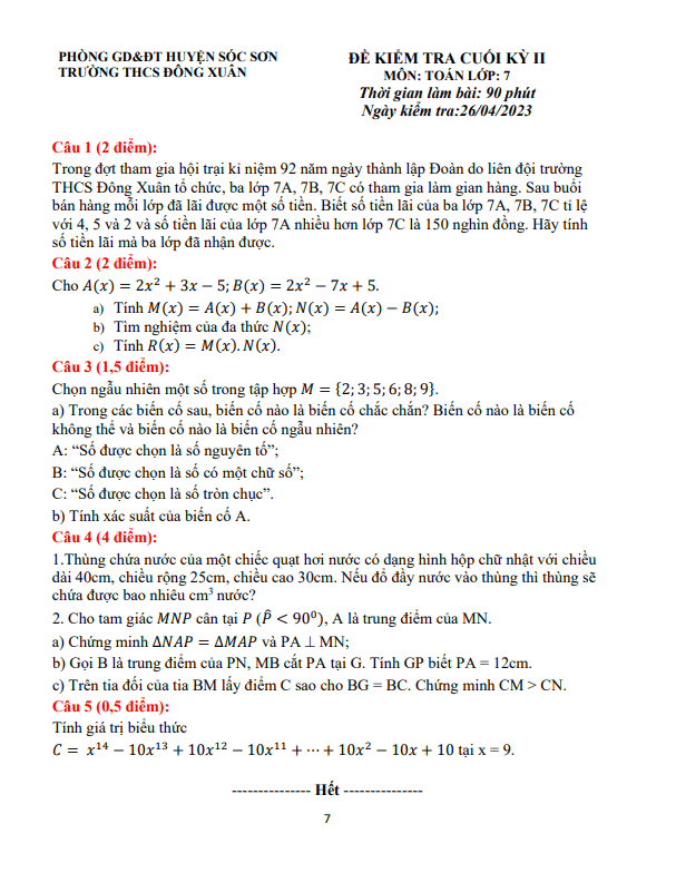 Đề cuối kỳ 2 môn Toán lớp 7 năm học 2022 – 2023 trường THCS Đông Xuân Hà Nội là một bước quan trọng để kiểm tra kiến thức và kỹ năng của học sinh sau một học kỳ dài. Đề thi cung cấp nhiều câu hỏi đa dạng, từ cơ bản đến nâng cao, giúp học sinh phát triển tư duy logic và khả năng giải quyết vấn đề.Trong đề thi, có một bài toán đặc biệt về việc tính toán số tiền lãi mà ba lớp 7A, 7B, 7C nhận được sau khi tham gia hội trại kỉ niệm. Học sinh cần phải sử dụng khái niệm tỉ lệ và giải hệ phương trình để giải quyết bài toán này. Đề cũng đặt ra các câu hỏi về xác suất và tính thể tích của hình hộp chữ nhật, đòi hỏi học sinh phải áp dụng kiến thức đã học vào thực tế.Ngoài ra, đề thi còn yêu cầu học sinh phân biệt các biến cố chắc chắn, không chắc chắn và ngẫu nhiên trong một tập hợp số đã cho. Điều này giúp học sinh hiểu rõ hơn về khái niệm xác suất và cách tính toán xác suất của một biến cố.Cuối cùng, đề thi cung cấp đáp án và lời giải chi tiết, giúp học sinh tự kiểm tra và tự rút kinh nghiệm sau khi làm bài. Đây là một cơ hội tốt để học sinh củng cố kiến thức và chuẩn bị tốt cho kỳ thi cuối kỳ.Trên tay mỗi học sinh là một cơ hội để thể hiện năng lực và khả năng của mình. Hãy cố gắng hết mình và tự tin trước mỗi bài toán để đạt được kết quả tốt trong kỳ thi sắp tới. Chúc các em thành công!
