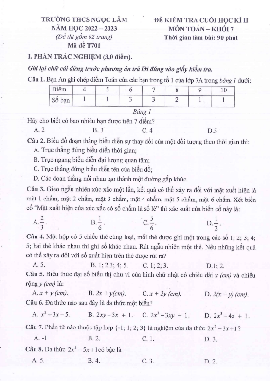 Chào các thầy cô và các em học sinh lớp 7! Hôm nay, Sytu xin giới thiệu đến mọi người đề kiểm tra chất lượng cuối học kì 2 môn Toán lớp 7 năm học 2022 – 2023 tại trường THCS Ngọc Lâm, quận Long Biên, Hà Nội. Đề thi có cấu trúc gồm 30% câu hỏi trắc nghiệm và 70% câu hỏi tự luận, thời gian làm bài là 90 phút.