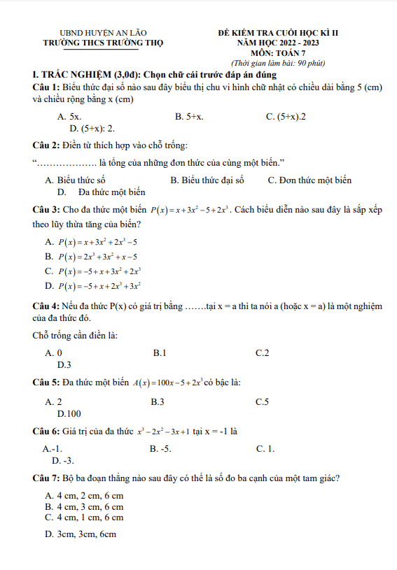 Đề cuối học kì 2 (HK2) lớp 7 môn Toán năm 2022 2023 trường THCS Trường Thọ Hải Phòng