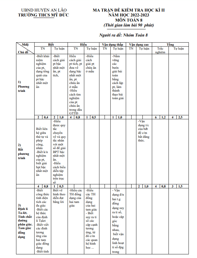 Dưới đây là bài toán đề cuối học kì 2 môn Toán lớp 8 năm học 2022-2023 của trường THCS Mỹ Đức, Hải Phòng:Bài toán 1: Một ô tô đi từ A đến B với vận tốc trung bình 60 km/h. Khi đến B, xe ô tô đã nghỉ 30 phút rồi quay trở về A với vận tốc 50 km/h. Biết tổng thời gian từ lúc đi tới lúc về đến A là 6 giờ. Hãy tính quãng đường AB?Bài toán 2: Cho ∆ABC vuông tại A. Vẽ đường cao AH (H thuộc BC), đường phân giác CD của góc ACB cắt AH tại E (D thuộc AB). Chứng minh:a) ∆HCA ≅ ∆ACB. Từ đó suy ra 2∆ABC ≅ ∆BCH.b) AE = ADc) DC/DB = EC/DABài toán 3: Cho hình lăng trụ đứng có các kích thước: CA = 3cm, AB = 4cm; BB’ = 7cm (hình vẽ). Tính thể tích của hình lăng trụ đó.Bạn có thể tải file WORD dành cho giáo viên để có đầy đủ ma trận đề thi, đáp án và hướng dẫn chấm điểm.Trên đây là những nội dung của đề cuối học kì 2 môn Toán lớp 8 năm học 2022-2023 của trường THCS Mỹ Đức, Hải Phòng. Hy vọng rằng thông tin này sẽ giúp ích cho quý thầy cô giáo và các em học sinh trong việc ôn tập và chuẩn bị cho kỳ thi. Chúc quý thầy cô giáo và các em học sinh thành công.