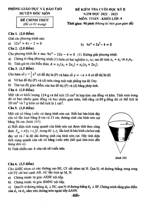 Đề cuối học kì 2 (HK2) Toán 9 năm 2022 2023 phòng GD ĐT Hóc Môn TP HCM