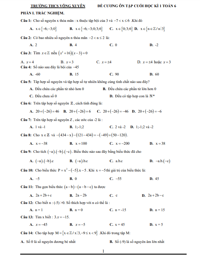 Xin chào quý thầy, cô giáo và các em học sinh lớp 6! Tôi xin giới thiệu đến quý vị đề cương ôn tập cuối học kì 1 môn Toán lớp 6 cho năm học 2022-2023 tại trường THCS Võng Xuyên, huyện Phúc Thọ, thành phố Hà Nội.
