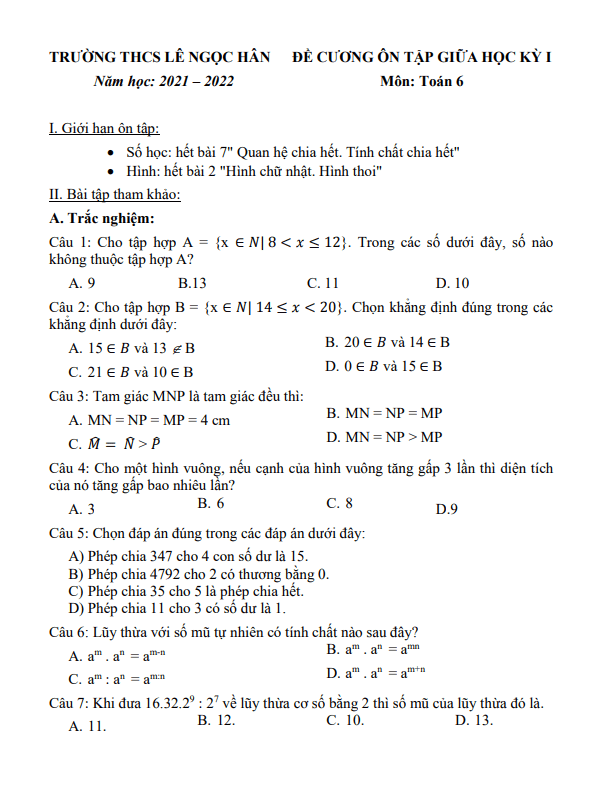 Đề cương giữa học kì 1 Toán lớp 6 trường THCS Lê Ngọc Hân Hà Nội