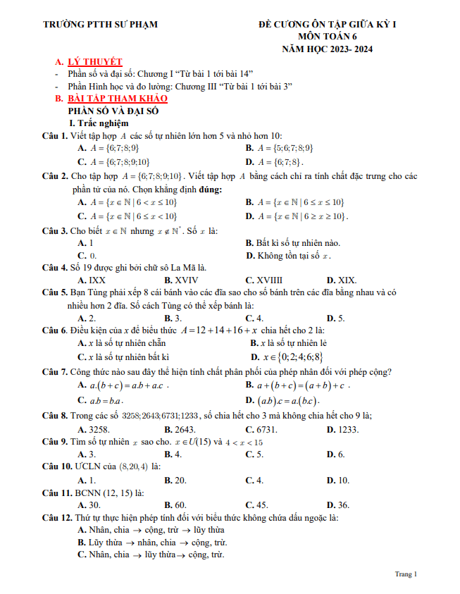 Đề cương giữa học kì 1 (HK1) lớp 6 môn Toán năm 2023 2024 trường PT Thực hành Sư phạm Đồng Nai