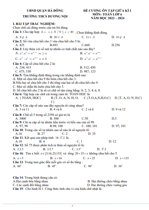 Sytu xin gửi đến quý thầy cô và các em học sinh lớp 6 đề cương ôn tập giữa học kì 1 môn Toán năm học 2023 – 2024 tại trường THCS Dương Nội, quận Hà Đông, thành phố Hà Nội. Đề cương bao gồm hai phần chính: Bài tập trắc nghiệm và bài tập tự luận.