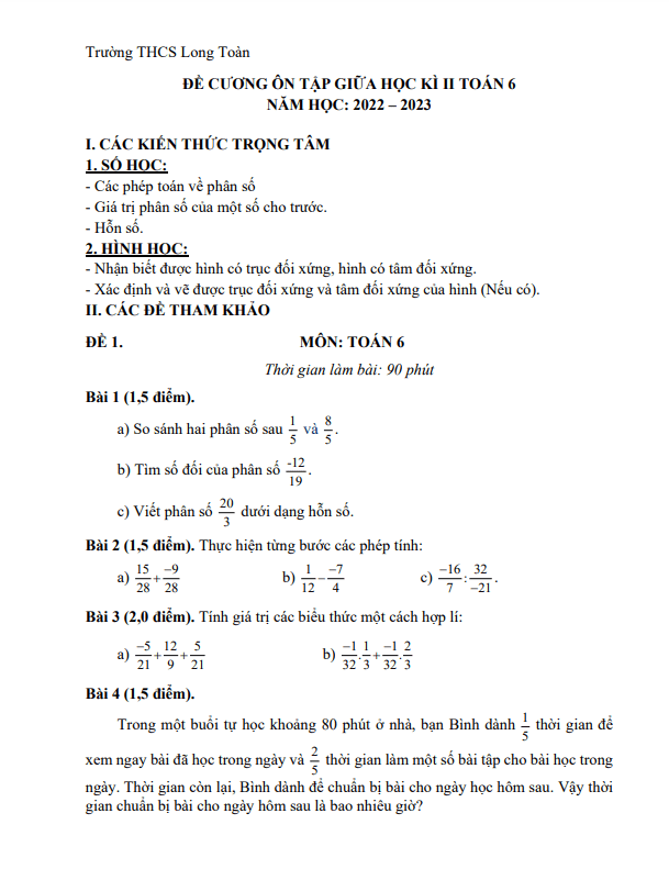 Đề cương giữa học kì 2 (HK2) lớp 6 môn Toán năm 2022-2023 trường THCS Long Toàn Bà Rịa – Vũng TàuSytu xin gửi đến quý thầy, cô giáo và các em học sinh lớp 6 đề cương ôn tập kiểm tra giữa học kì 2 môn Toán lớp 6 năm học 2022-2023 tại trường THCS Long Toàn, tỉnh Bà Rịa – Vũng Tàu.I. CÁC KIẾN THỨC TRỌNG TÂM:1. SỐ HỌC:- Các phép toán liên quan đến phân số.- Tính giá trị của phân số khi có số cho trước.- Hiểu về hỗn số.2. HÌNH HỌC:- Nhận biết và phân biệt hình có trục đối xứng và hình có tâm đối xứng.- Xác định và vẽ trục đối xứng, tâm đối xứng của hình (nếu có).II. CÁC ĐỀ THAM KHẢO (File WORD dành cho quý thầy, cô):Sau đây là danh sách các đề tham khảo thiết kế dưới định dạng Word dành cho quý thầy, cô giáo:- Đề tham khảo số 1: Phân số và giá trị phân số.- Đề tham khảo số 2: Hỗn số và phép tính liên quan.- Đề tham khảo số 3: Hình có trục đối xứng.- Đề tham khảo số 4: Hình có tâm đối xứng.HÃY NHỚ RẰNG NHIỆM VỤ CỦA BẠN LÀ VIẾT LẠI NỘI DUNG GỐC THEO TỪ NGỮ VÀ CẤU TRÚC CỦA BẠN. KHÔNG ĐỔI NỘI DUNG GỐC MÀ VIẾT RA MỘT NỘI DUNG MỚI KHÁC. HÃY NHỚ RẰNG NHIỆM VỤ CỦA BẠN LÀ VIẾT LẠI NỘI DUNG GỐC THEO TỪ NGỮ VÀ CẤU TRÚC CỦA BẠN. KHÔNG ĐỔI NỘI DUNG GỐC MÀ VIẾT RA MỘT NỘI DUNG MỚI KHÁC.