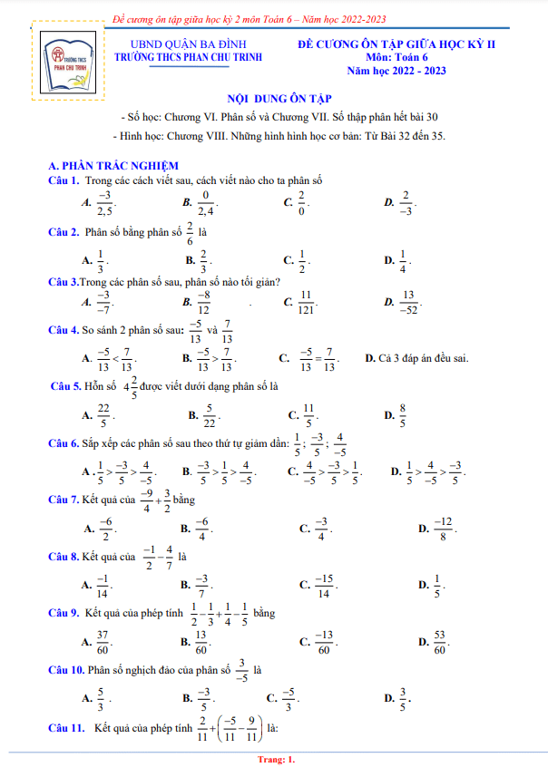 Sytu xin gửi đến quý thầy, cô giáo và các em học sinh lớp 6 đề cương ôn tập kiểm tra giữa học kỳ 2 môn Toán lớp 6 năm học 2022-2023 tại trường THCS Phan Chu Trinh, quận Ba Đình, thành phố Hà Nội. Đề cương này sẽ giúp các em nắm vững kiến thức và chuẩn bị tốt nhất cho kỳ thi giữa học kỳ 2.
