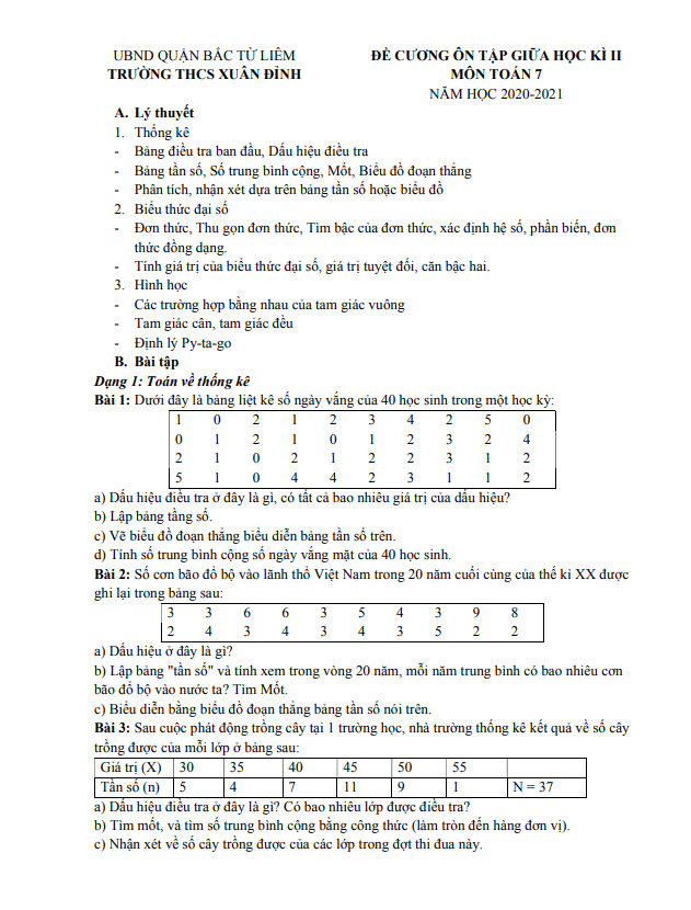 Đề cương giữa học kì 2 (HK2) lớp 7 môn Toán năm 2020 2021 trường THCS Xuân Đỉnh Hà Nội