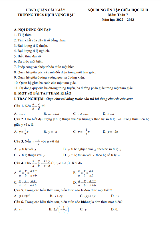 Đề cương hướng dẫn ôn tập kiểm tra giữa học kì 2 môn Toán lớp 7 năm học 2022 – 2023 trường THCS Dịch Vọng Hậu, quận Cầu Giấy, thành phố Hà NộiChào đồng chí thầy cô giáo và các em học sinh lớp 7! Sytu xin giới thiệu đến quý thầy, cô giáo và các em học sinh đề cương ôn tập kiểm tra giữa học kì 2 môn Toán. Đề cương này bao gồm các nội dung sau:A. NỘI DUNG ÔN TẬP1. Tỉ lệ thức: Các bài toán liên quan đến tỉ lệ giữa các đại lượng.2. Tính chất của dãy tỉ số bằng nhau: Tìm hiểu về tính chất của các dãy tỉ số bằng nhau.3. Đại lượng tỉ lệ thuận: Bài toán về đại lượng tỉ lệ thuận và cách giải.4. Đại lượng tỉ lệ nghịch: Bài tập về đại lượng tỉ lệ nghịch và ứng dụng.5. Biểu thức đại số: Các phép tính cơ bản với biểu thức đại số.6. Đa thức một biến: Tìm hiểu về đa thức một biến và cách tính toán.7. Phép cộng và phép trừ đa thức một biến: Các phép tính cộng và trừ đa thức.8. Quan hệ giữa góc và cạnh đối diện trong tam giác: Bài toán về quan hệ giữa góc và cạnh trong tam giác.9. Quan hệ giữa đường vuông góc và đường xiên: Tìm hiểu về quan hệ giữa đường vuông góc và đường xiên trong tam giác.10. Quan hệ giữa ba cạnh của tam giác: Bài tập về quan hệ giữa ba cạnh của tam giác.11. Sự đồng quy của ba đường trung tuyến, ba đường phân giác trong tam giác: Tìm hiểu về sự đồng quy của các đường trung tuyến, đường phân giác trong tam giác.B. MỘT SỐ BÀI TẬP THAM KHẢOĐể giúp quý thầy, cô và các em học sinh ôn tập tốt hơn, chúng tôi cũng cung cấp file Word chứa một số bài tập tham khảo.Hi vọng rằng đề cương ôn tập này sẽ giúp các em học sinh lớp 7 nắm vững kiến thức và chuẩn bị tốt cho kỳ thi giữa học kì 2. Chúc quý thầy, cô giáo và các em học sinh thành công!