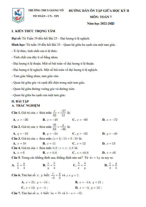 Đề cương giữa học kì 2 (HK2) môn Toán lớp 7 năm học 2022 – 2023 trường THCS Giảng Võ Hà Nội đã được Sytu giới thiệu đến quý thầy cô và các em học sinh lớp 7. Đề cương này sẽ hướng dẫn ôn tập kiểm tra giữa học kỳ 2 môn Toán.I. Kiến thức trọng tâm:1. Đại lượng tỉ lệ:- Từ Tuần 19 đến hết Bài 23: Đại lượng tỉ lệ nghịch.- Tính chất của tỉ lệ thức.- Tính chất của dãy tỉ số bằng nhau.- Đại lượng tỉ lệ thuận và nghịch.- Bài toán về đại lượng tỉ lệ thuận và nghịch.2. Hình học:- Từ Tuần 19 đến hết Bài 33: Quan hệ giữa ba cạnh của tam giác.- Tam giác bằng nhau, tam giác cân.- Quan hệ giữa góc và cạnh đối diện trong tam giác.- Quan hệ giữa đường vuông góc và đường xiên trong tam giác.II. Bài tập: File WORD (dành cho thầy cô) sẽ được cung cấp.Đề cương này giúp các em học sinh lớp 7 ôn tập các kiến thức cơ bản và quan trọng trong môn Toán để chuẩn bị tốt cho kỳ kiểm tra giữa học kì 2. Hy vọng rằng thông tin trên sẽ giúp các em tự tin và thành công trong việc học tập.