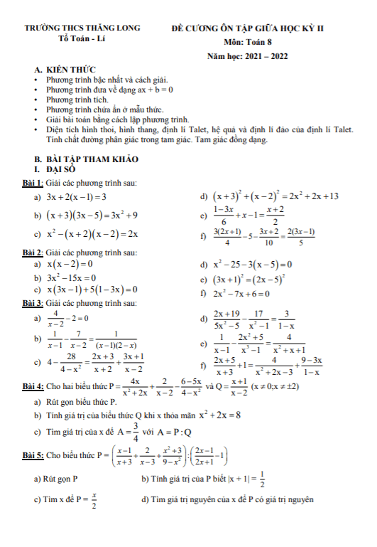 Đề cương giữa học kì 2 môn Toán lớp 8 năm học 2021-2022 tại trường THCS Thăng Long Hà Nội đã được Sytu giới thiệu đến các thầy cô giáo và các em học sinh. Đề cương bao gồm những kiến thức cơ bản như phương trình bậc nhất và cách giải, phương trình tích, phương trình chứa ẩn ở mẫu thức, giải bài toán bằng cách lập phương trình. Ngoài ra còn có các nội dung về diện tích hình thoi, hình thang, định lí Talet, hệ quả và định lí đảo của định lí Talet, tính chất đường phân giác trong tam giác và tam giác đồng dạng.Mục tiêu của đề cương là giúp học sinh ôn tập và củng cố kiến thức đã học, chuẩn bị tốt nhất cho kì thi giữa học kì 2. Nội dung của đề cương được tổ chức rõ ràng, dễ hiểu, giúp học sinh nắm vững kiến thức và rèn luyện kỹ năng giải các bài tập.Đây là tài liệu hữu ích không chỉ cho việc ôn tập mà còn là nguồn tư liệu học tập quan trọng cho các em học sinh. Mong rằng thông qua việc tham khảo và ôn tập theo đề cương này, học sinh sẽ đạt được kết quả tốt trong kỳ thi sắp tới.