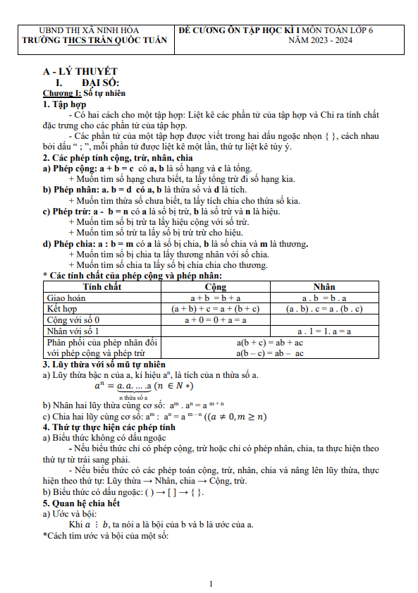 Đề cương học kì 1 môn Toán lớp 6 năm 2023 2024 trường THCS Trần Quốc Tuấn Khánh Hòa