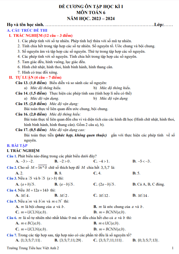 Đề cương học kì 1 môn Toán lớp 6 năm 2023-2024 trường Việt Anh 2 Bình DươngSytu xin gửi đến quý thầy cô và các em học sinh lớp 6 đề cương ôn tập cuối học kì 1 môn Toán. Đề cương bao gồm hai phần chính như sau:I. TRẮC NGHIỆM (12 câu – 3 điểm)1. Các phép tính với số tự nhiên và phép tính luỹ thừa với số mũ tự nhiên.2. Tính chia hết trong tập hợp các số tự nhiên, số nguyên tố, ước chung và bội chung.3. Số nguyên âm, tập hợp các số nguyên và thứ tự trong tập hợp số nguyên.4. Các phép tính với số nguyên, tính chia hết trong tập hợp các số nguyên.5. Tam giác đều, hình vuông, lục giác đều.6. Hình chữ nhật, hình thoi, hình bình hành, hình thang cân.7. Hình có trục đối xứng.II. TỰ LUẬN (4 câu – 7 điểm)- So sánh các số nguyên- Thực hiện các phép tính – Bài toán thực tế liên quan đến ước chung, bội chung- Bài toán liên quan đến chu vi và diện tích của các hình đã họcNgoài ra, còn có bài tập trong file Word dành cho quý thầy cô để tham khảo và sử dụng trong quá trình ôn tập. Mong rằng đề cương này sẽ giúp các em học sinh chuẩn bị tốt cho kỳ thi cuối kì và đạt kết quả cao. Chúc quý thầy cô và các em thành công!