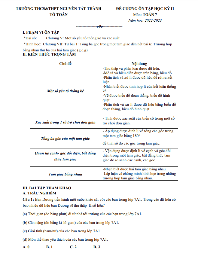 Sytu xin gửi đến quý thầy cô và các em học sinh lớp 7 đề cương ôn tập học kỳ 2 môn Toán năm học 2022-2023 tại trường THCS & THPT Nguyễn Tất Thành, Hà Nội.