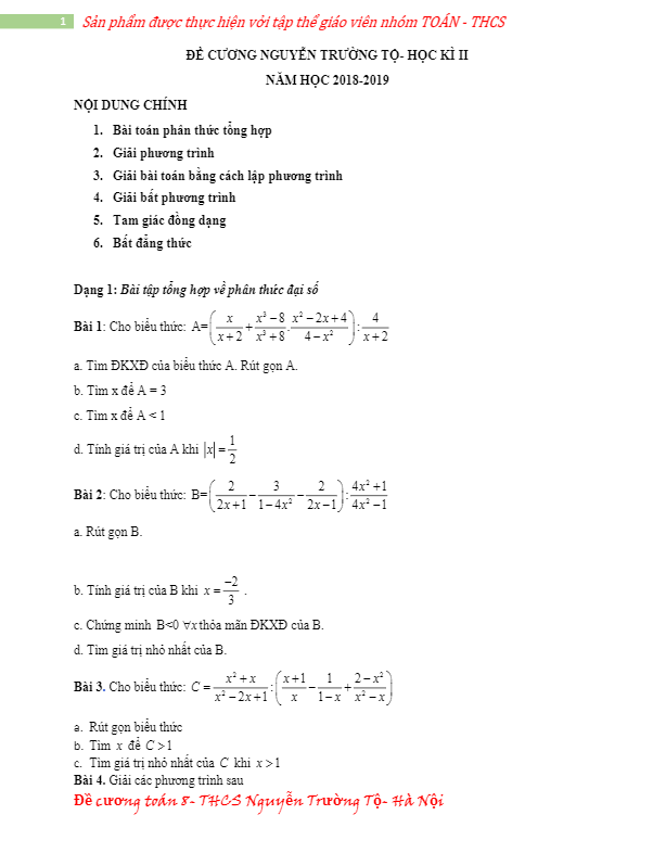 Chào mừng đến với đề cương Toán lớp 8 HK2 năm 2018 – 2019 của trường THCS Nguyễn Trường Tộ – Hà Nội. Đề cương này tập trung vào việc chọn lọc các bài toán đại diện cho 06 dạng toán phổ biến như: bài toán phân thức tổng hợp, giải phương trình, giải bài toán bằng cách lập phương trình, giải bất phương trình, tam giác đồng dạng, bất đẳng thức… để giúp học sinh lớp 8 ôn tập hiệu quả cho kỳ thi học kỳ 2 Toán lớp 8.