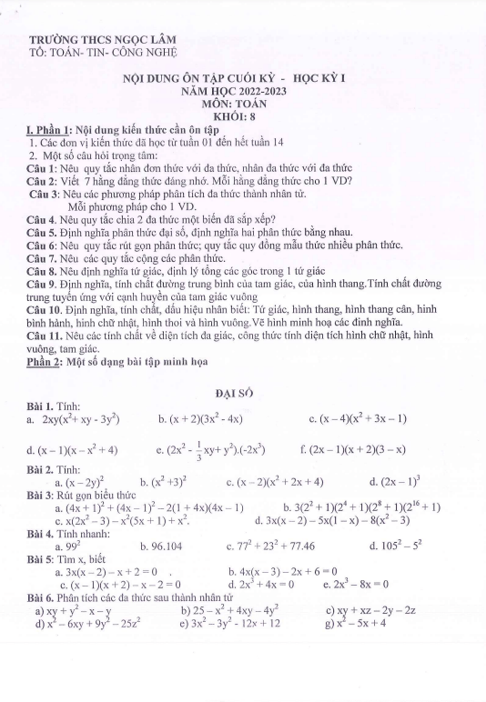 Chào quý thầy cô và các em học sinh lớp 8 trường THCS Ngọc Lâm Hà Nội, dưới đây là đề cương hướng dẫn nội dung ôn tập cuối học kỳ 1 môn Toán.
