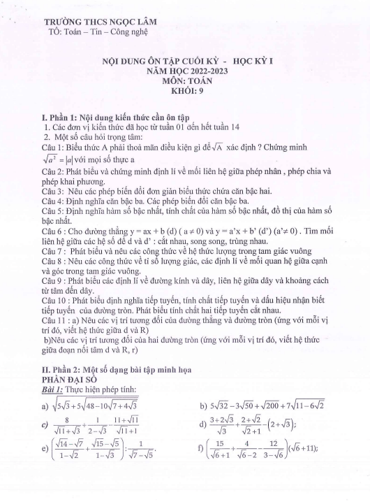 Chào các thầy cô và các em học sinh lớp 9, Sytu xin giới thiệu tới quý vị tài liệu đề cương hướng dẫn nội dung ôn tập cuối học kỳ 1 môn Toán lớp 9, năm học 2022 – 2023 tại trường THCS Ngọc Lâm, quận Long Biên, thành phố Hà Nội.