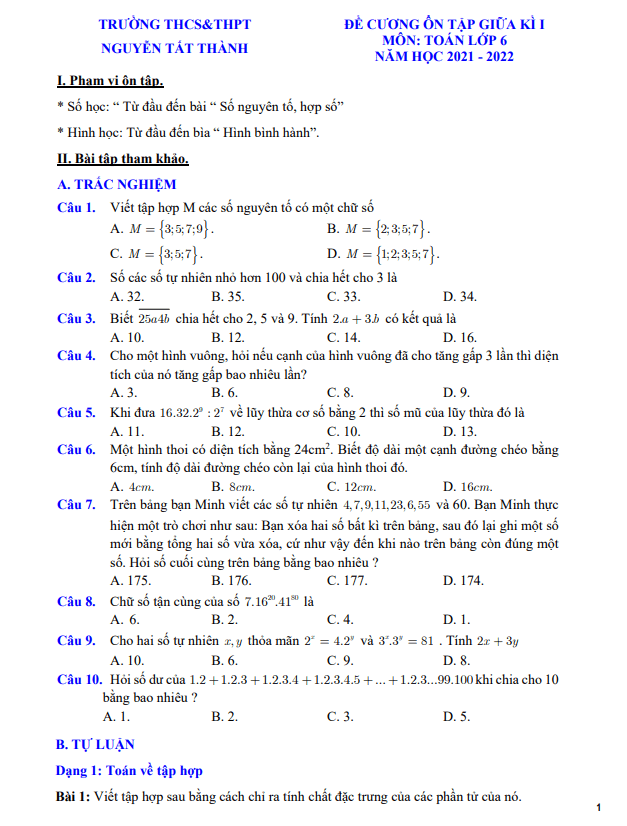 Đề cương ôn tập giữa học kì 1 (HK1) lớp 6 môn Toán năm 2021 2022 trường Nguyễn Tất Thành Hà Nội