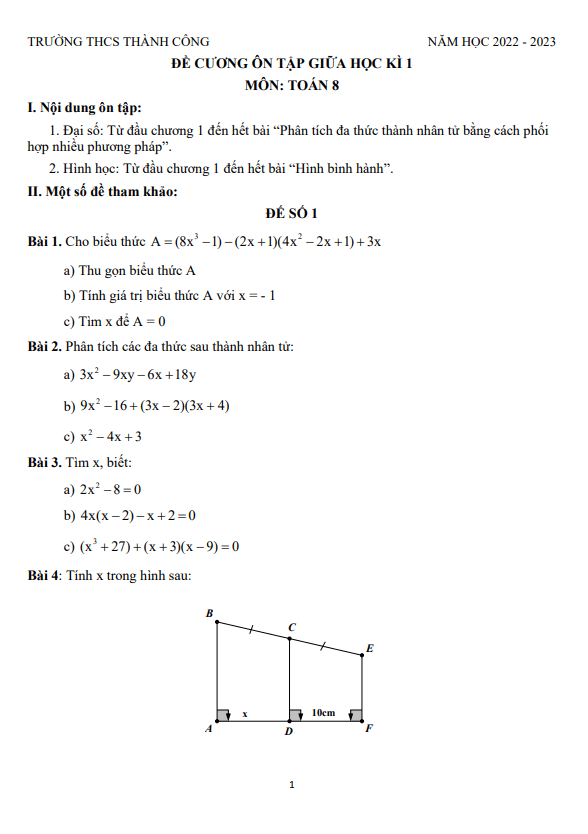 Một tài liệu ôn tập Toán lớp 8 giữa học kì 1 trường THCS Thành Công Hà Nội