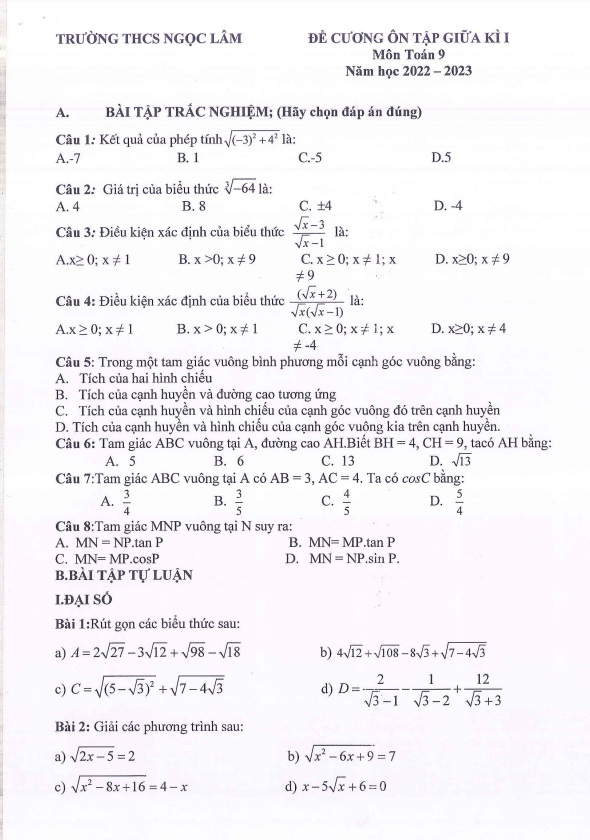 Sytu xin giới thiệu đến quý thầy cô và các em học sinh lớp 9 tài liệu đề cương hướng dẫn ôn tập giữa học kì 1 môn Toán lớp 9 năm học 2022 – 2023 của trường THCS Ngọc Lâm, đây là tài liệu được chuẩn bị kỹ lưỡng nhằm giúp các em học sinh ôn tập môn Toán một cách hiệu quả.