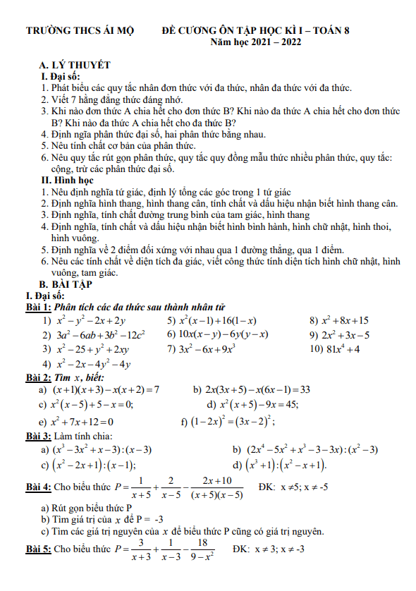 Đề cương ôn tập học kì 1 (HK1) lớp 8 môn Toán năm 2021 2022 trường THCS Ái Mộ Hà Nội