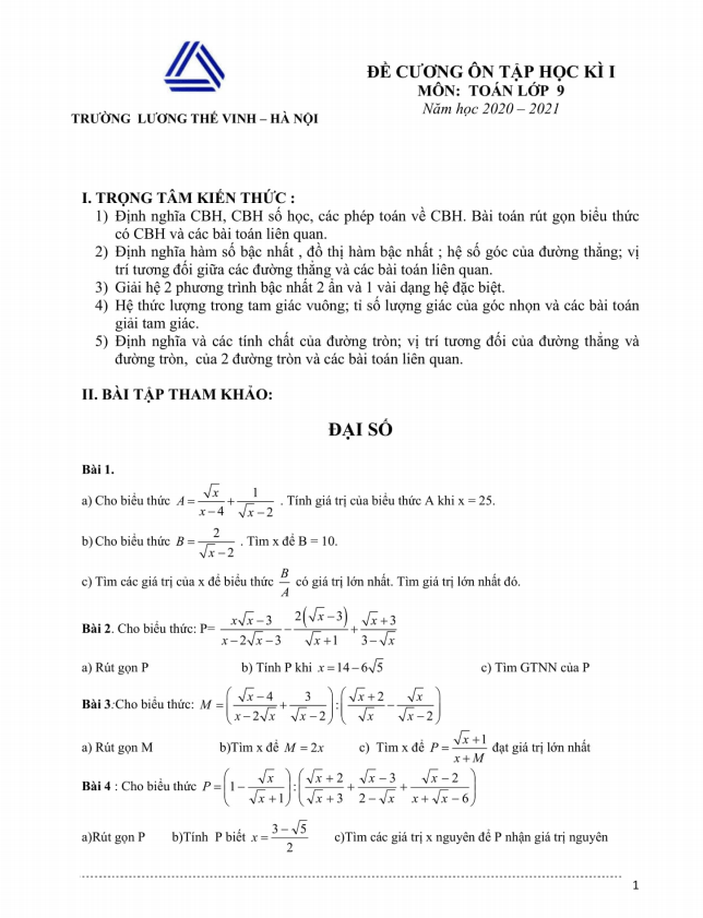 Đề cương ôn tập học kì 1 (HK1) lớp 9 môn Toán năm 2020-2021 trường Lương Thế Vinh Hà Nội