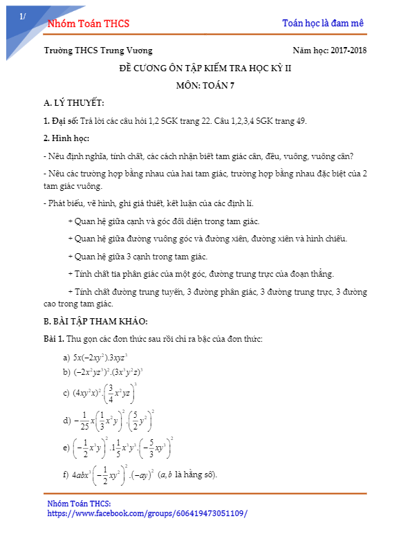 Đề cương ôn tập học kì 2 (HK2) lớp 7 môn Toán năm 2017 2018 trường THCS Trưng Vương Hà Nội