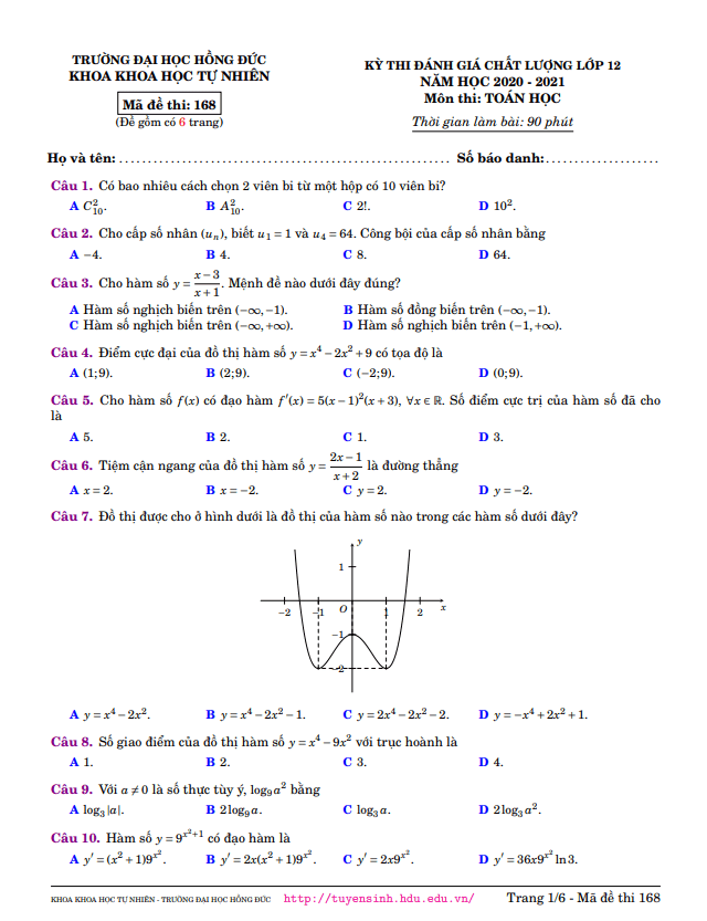 Đề đánh giá chất lượng môn Toán lớp 12 năm học 2020 – 2021 của trường Đại học Hồng Đức Thanh Hóa đã được biên soạn theo hình thức đề 100% trắc nghiệm. Đề bao gồm 50 câu hỏi và bài toán trải qua 06 trang, thời gian làm bài được xác định là 90 phút. Đặc biệt, đề thi đi kèm đáp án và lời giải chi tiết giúp học sinh tự kiểm tra và rút kinh nghiệm sau khi làm bài.