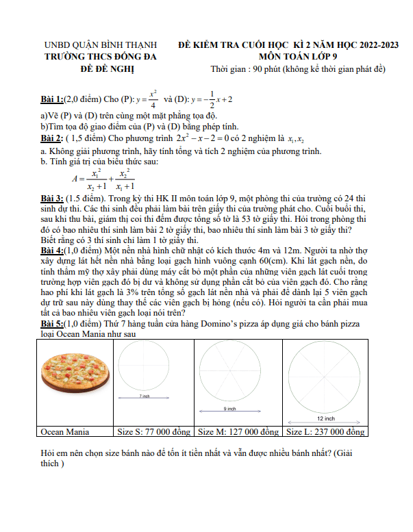 Đề đề nghị cuối học kì 2 môn Toán lớp 9 năm 2022-2023 trường THCS Đống Đa TP HCM