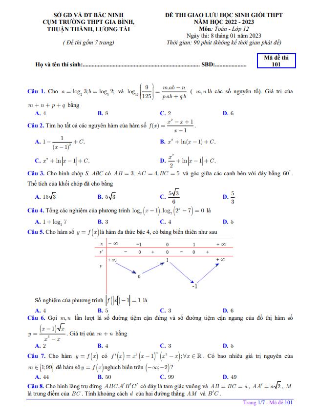 Chào đón quý thầy cô và các em học sinh lớp 12, Sytu xin giới thiệu đến các bạn đề thi giao lưu học sinh giỏi môn Toán lớp 12 năm học 2022 – 2023 của cụm trường THPT Gia Bình, Thuận Thành, Lương Tài thuộc sở Giáo dục và Đào tạo tỉnh Bắc Ninh. Đề thi được biên soạn dưới dạng trắc nghiệm với 50 câu hỏi và bài toán, thời gian làm bài 90 phút (không tính thời gian phát đề).