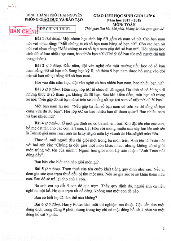 Đề giao lưu học sinh giỏi Toán lớp 6 năm 2017 – 2018 của phòng GD&ĐT thành phố Thái Nguyên là một cơ hội để các học sinh giỏi có thể thể hiện khả năng, kiến thức và kỹ năng Toán của mình. Đề thi được thiết kế theo cấu trúc và nội dung chuẩn của chương trình học, đảm bảo tính toàn diện và khách quan.