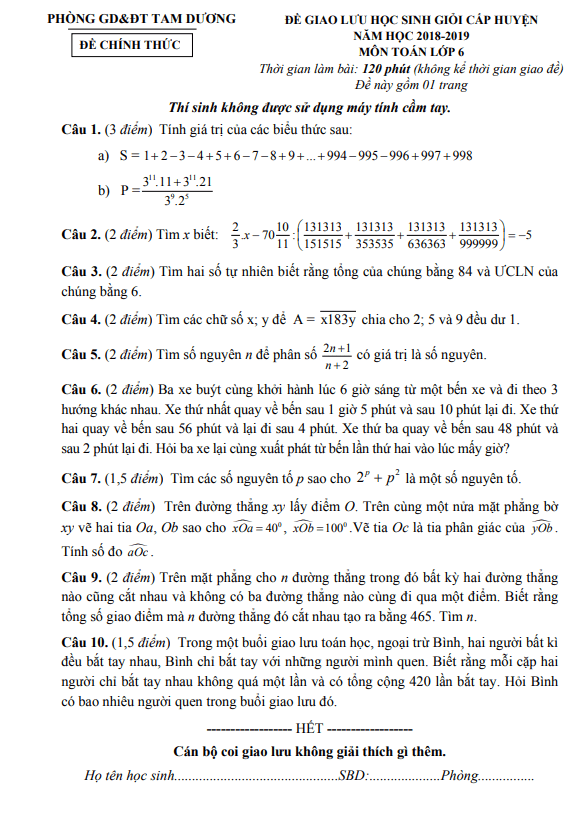 Đề giao lưu HSG lớp 6 môn Toán năm 2018 2019 phòng GD ĐT Tam Dương Vĩnh Phúc
