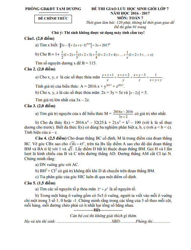 Đề Giao Lưu HSG Toán Lớp 7 Năm 2016-2017 Phòng GD&ĐT Tam Dương Vĩnh Phúc
