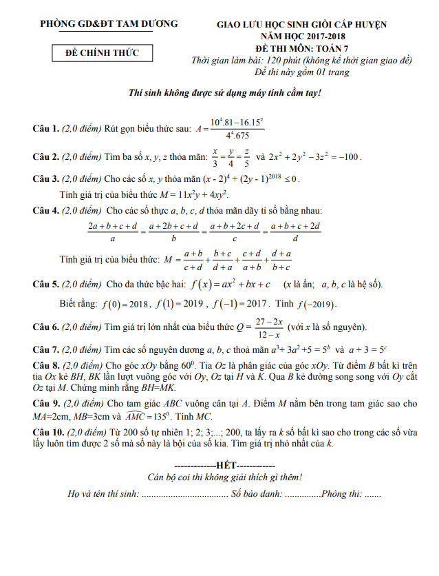 Sytu xin chào đến quý thầy cô và các em học sinh lớp 7. Dưới đây là đề giao lưu HSG môn Toán lớp 7 năm 2017-2018 của phòng GD&ĐT Tam Dương – Vĩnh Phúc. Đề thi bao gồm đáp án, lời giải và thang điểm.