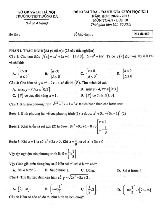 Đề học kỳ 1 Toán lớp 10 năm 2022 – 2023 trường THPT Đống Đa Hà Nội
