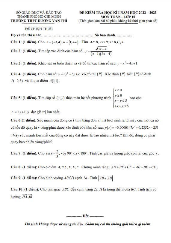 Sytu xin chào quý thầy cô và các em học sinh lớp 10! Hôm nay chúng ta hãy cùng tìm hiểu về đề kiểm tra cuối học kì 1 môn Toán lớp 10 năm học 2022 – 2023 từ trường THPT Dương Văn Thì tại TP Hồ Chí Minh.