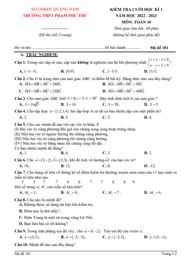 Đề học kì 1 Toán lớp 10 năm 2022 – 2023 trường THPT Phạm Phú Thứ – Quảng Nam