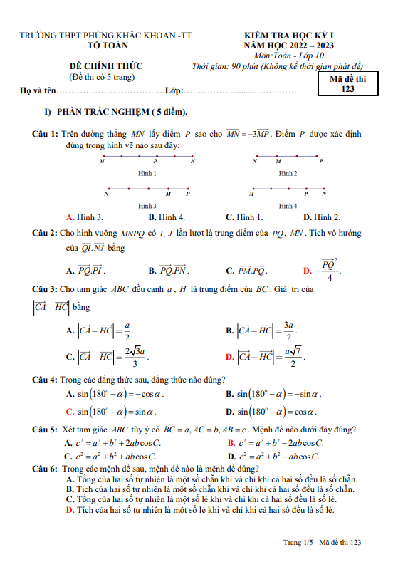 Xin chào quý thầy cô giáo và các em học sinh lớp 10! Dưới đây là đề kiểm tra cuối học kỳ 1 môn Toán lớp 10 năm học 2022 – 2023 của trường THPT Phùng Khắc Khoan, Hà Nội. Đề thi bao gồm 25 câu trắc nghiệm (tổng cộng 5 điểm) và 5 câu tự luận (tổng cộng 5 điểm), thời gian làm bài là 90 phút (không tính thời gian phát đề). Bạn sẽ được cung cấp đáp án và lời giải chi tiết cho mã đề Thi 123 và mã đề Thi 456.
