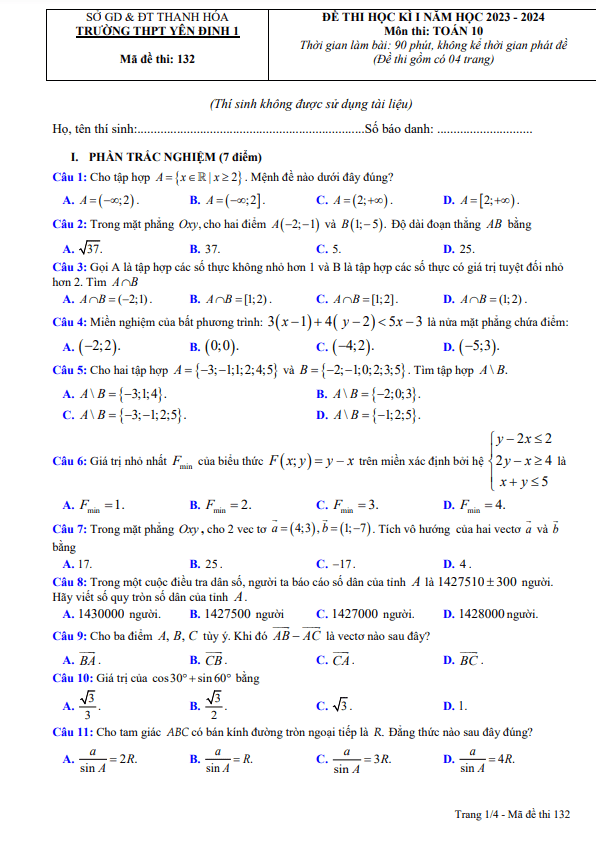 Đề học kì 1 Toán lớp 10 năm 2023-2024 trường THPT Yên Định 1 Thanh Hóa