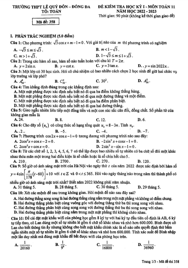 Đề học kỳ 1 Toán lớp 11 năm 2022 – 2023 trường THPT Lê Quý Đôn Hà Nội