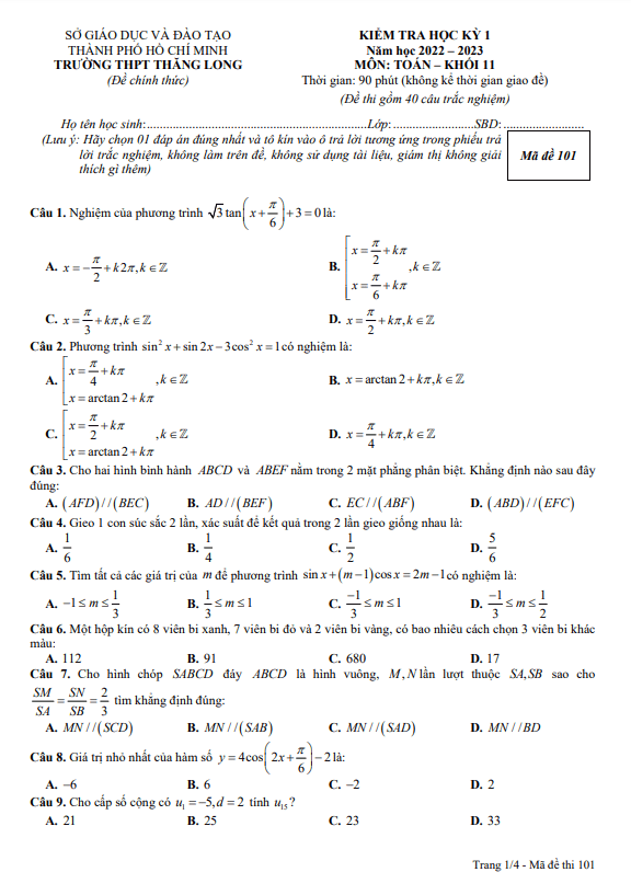 Chào mừng quý thầy cô và các em học sinh lớp 11! Hôm nay chúng ta sẽ cùng tìm hiểu về đề kiểm tra cuối học kỳ 1 môn Toán lớp 11 năm học 2022 – 2023 tại trường THPT Thăng Long, thành phố Hồ Chí Minh. Đề thi bao gồm các câu hỏi trắc nghiệm mã đề 101 – 102 – 103 – 104 để giúp các em ôn tập và kiểm tra kiến thức đã học.