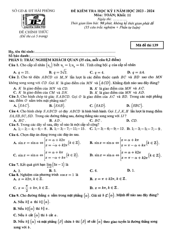 Xin chào quí thầy cô và các em học sinh lớp 11! Dưới đây là đề kiểm tra cuối học kỳ 1 môn Toán lớp 11 năm học 2023 – 2024 tại trường THPT chuyên Trần Phú, thành phố Hải Phòng. Đề thi mang mã số 139 với 05 trang, bao gồm 70% câu hỏi trắc nghiệm và 30% câu hỏi tự luận, thời gian làm bài là 90 phút.