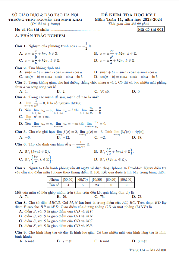 Đề học kỳ 1 Toán lớp 11 năm 2023 – 2024 trường Nguyễn Thị Minh Khai Hà Nội